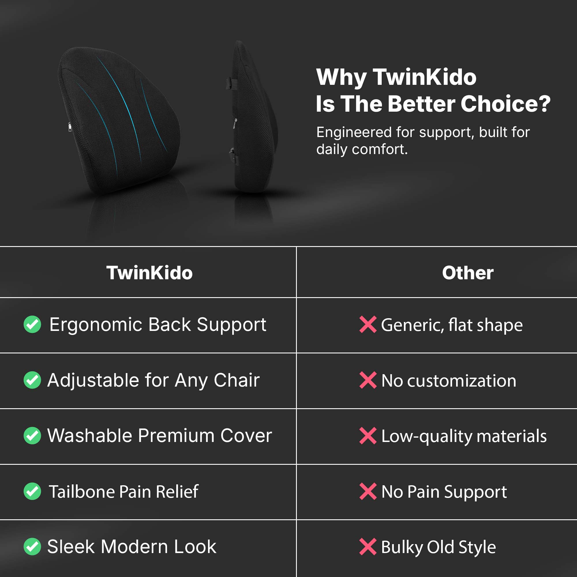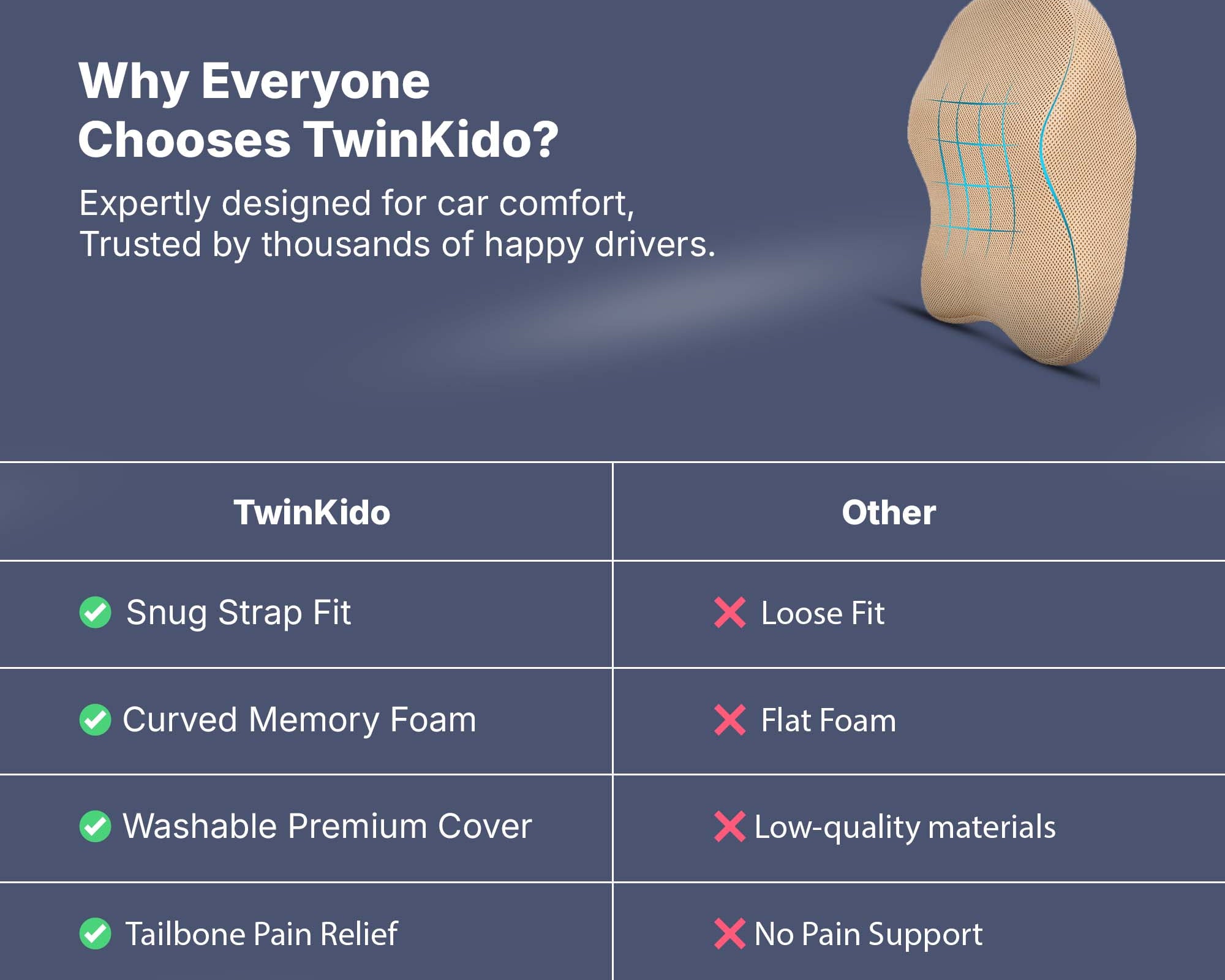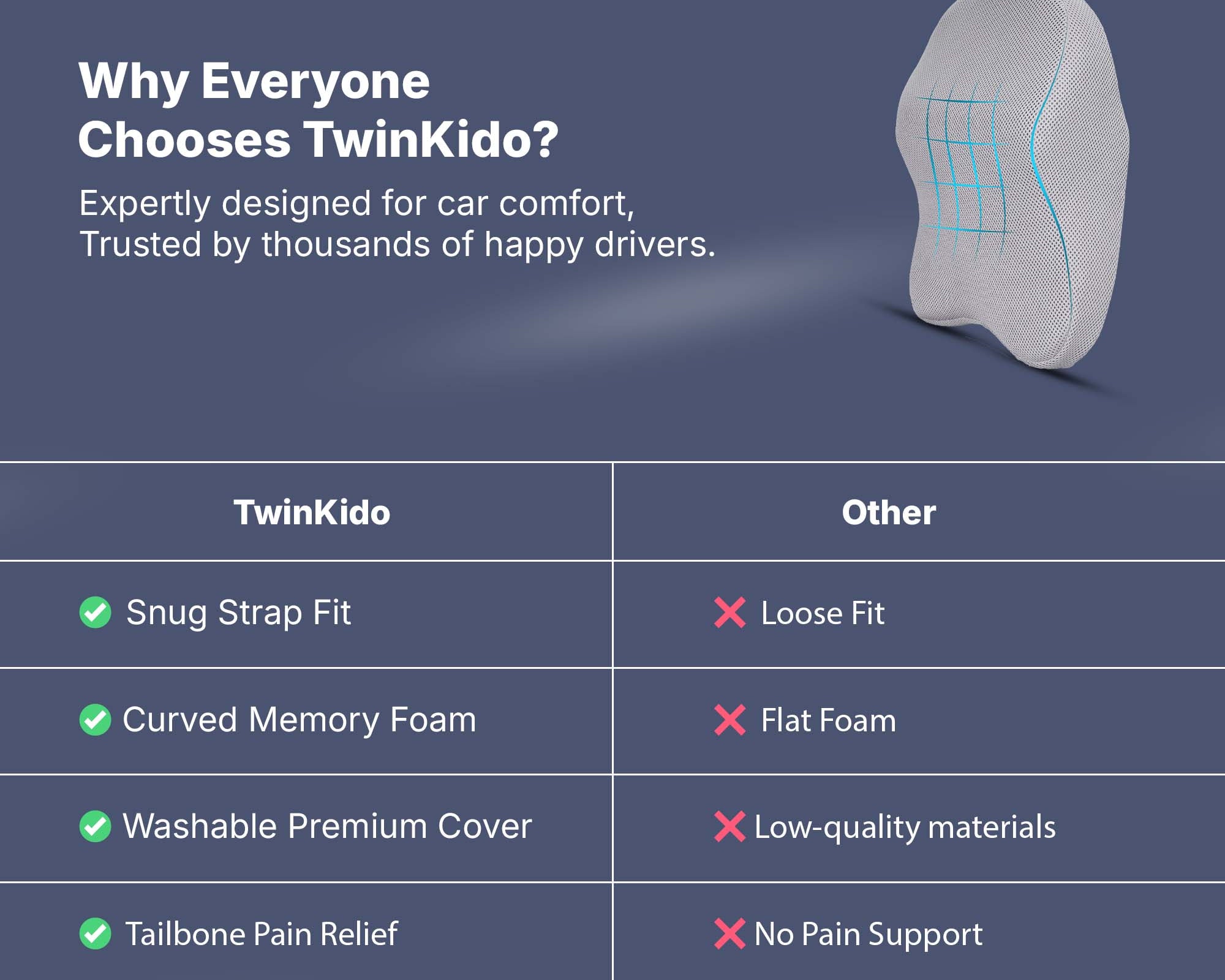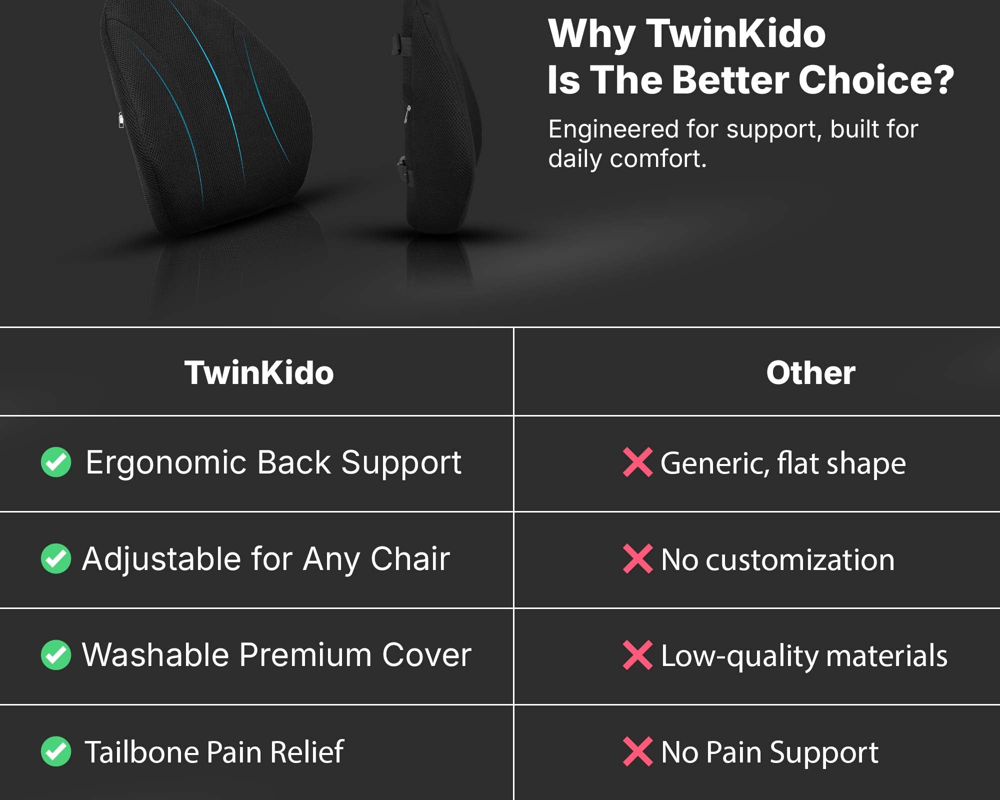 Twinkido doesn’t just build products but we combine science, comfort, and durability to create holistic ergonomic solutions that provide basic pain relief and sleep improvement. Our focus is on improving your overall wellness in today’s fast-paced lifestyle.