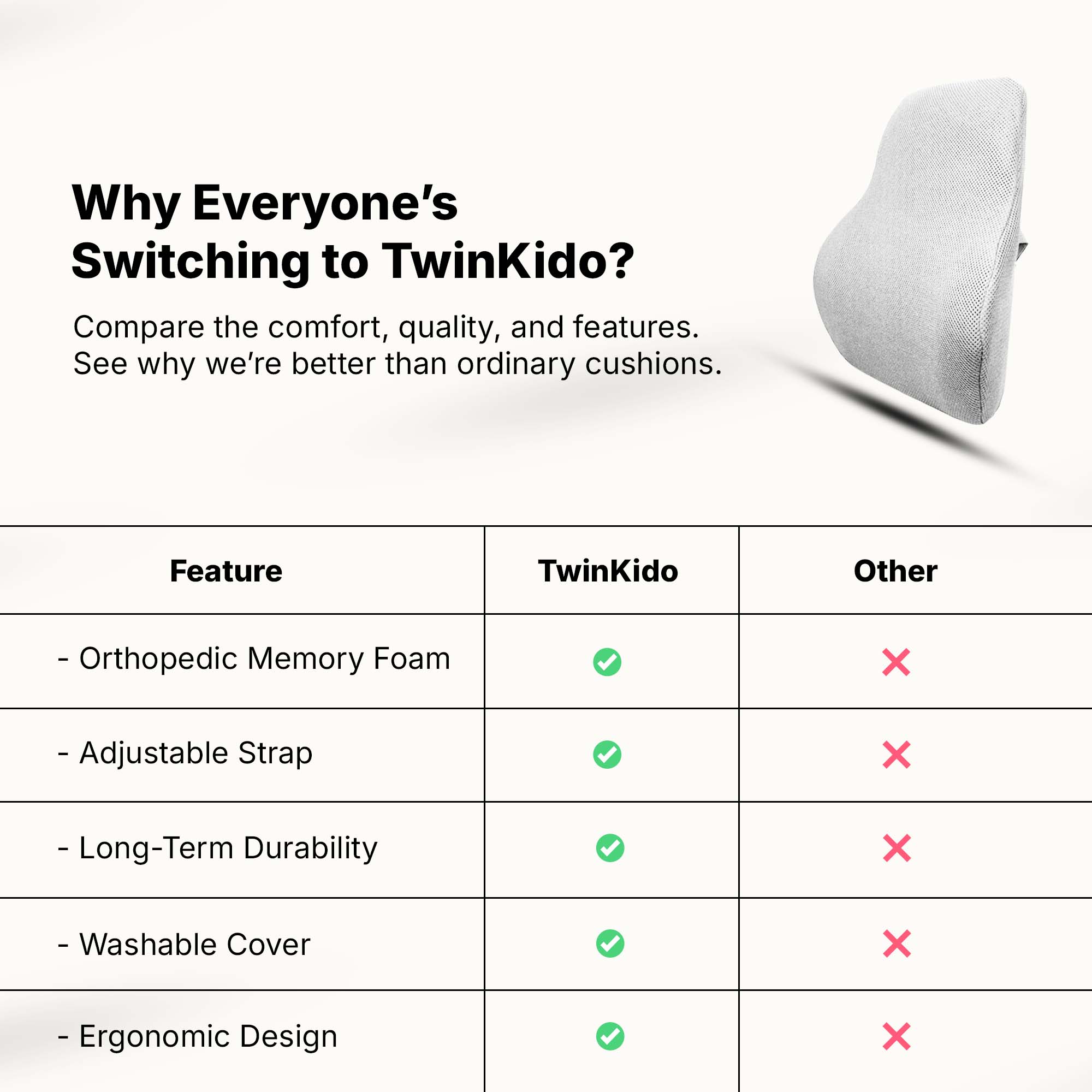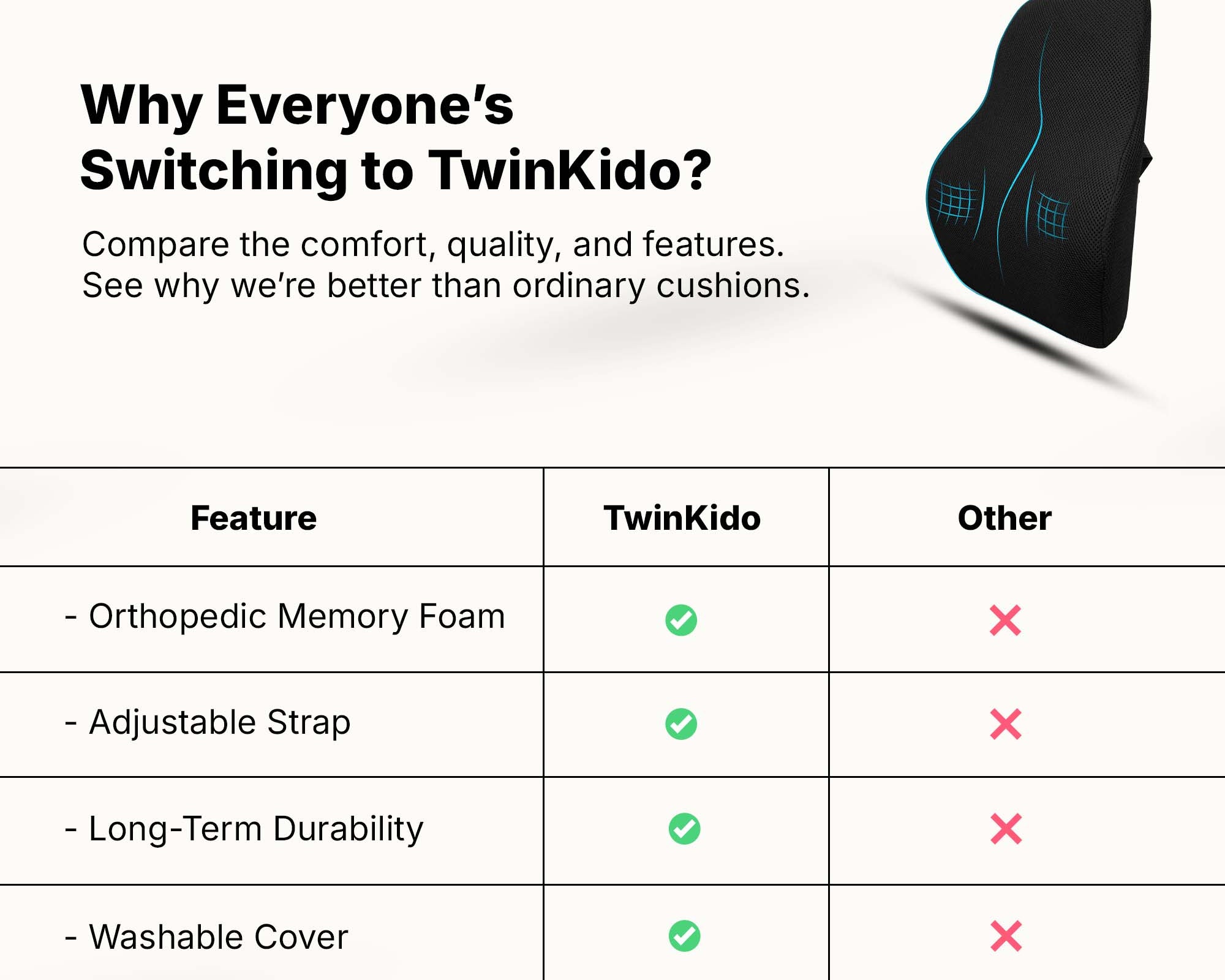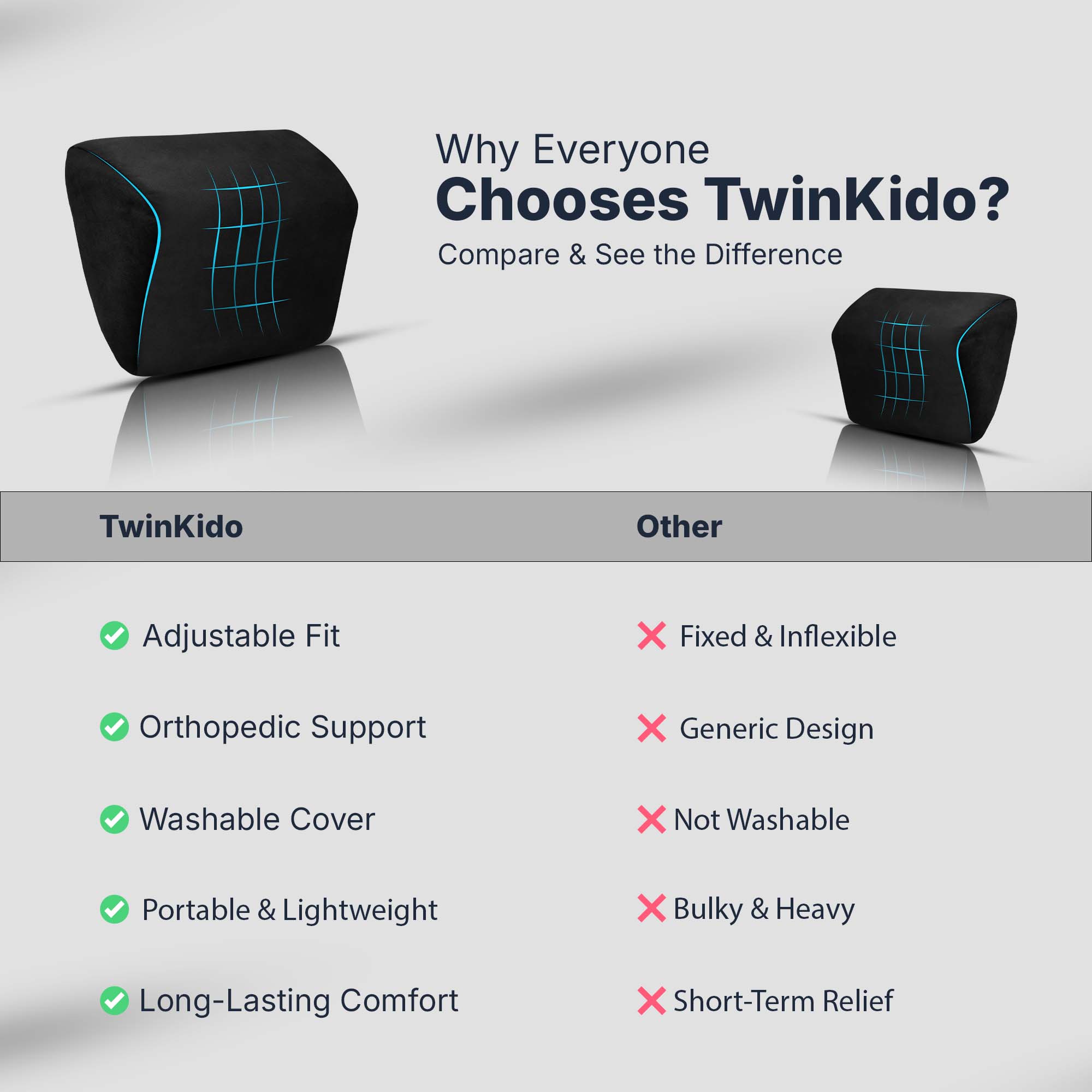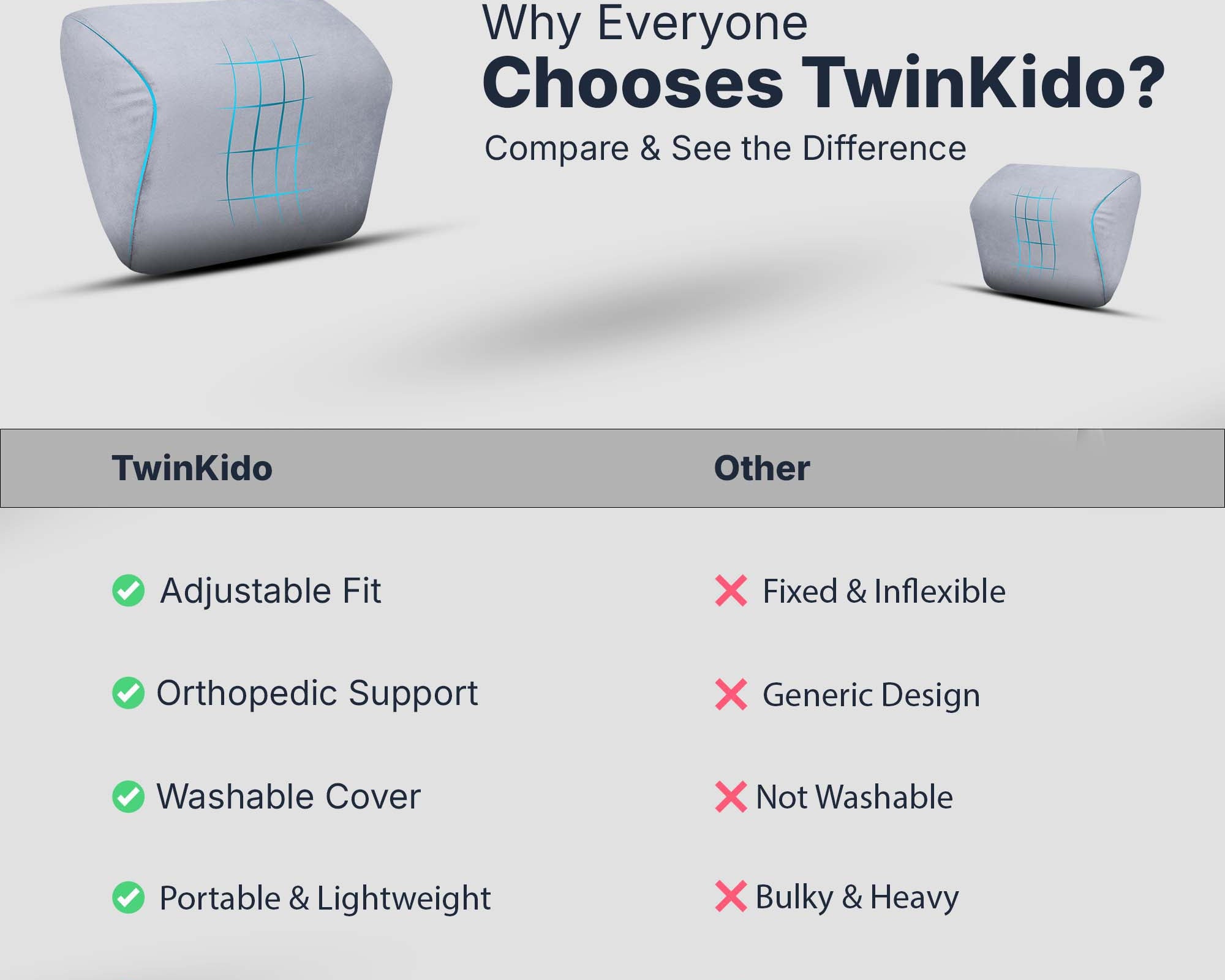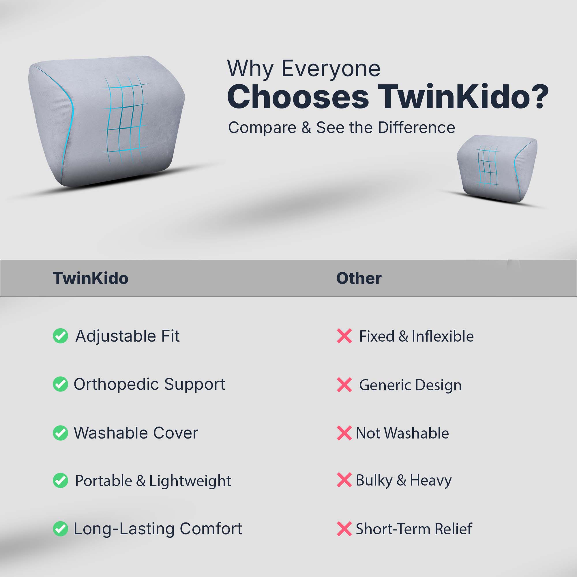 Twinkido products are suitable for everyone—working professionals, elders, frequent travelers, and students. Anyone seeking comfort while working, sleeping, or relaxing, should choose Twinkido.