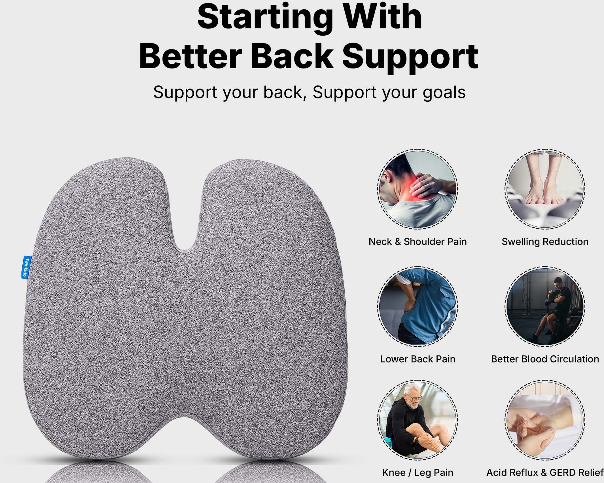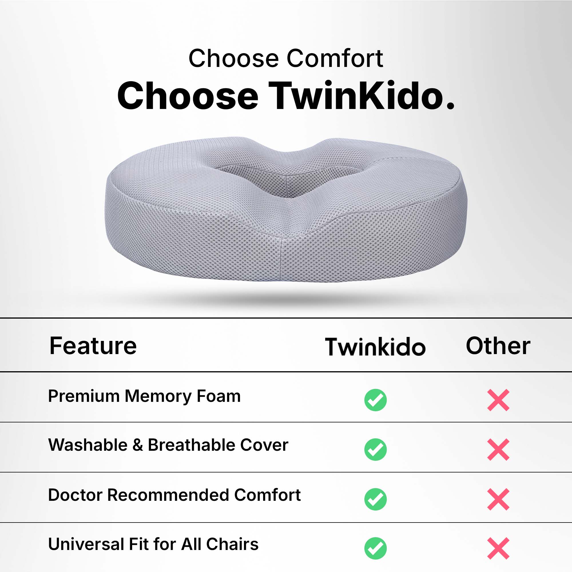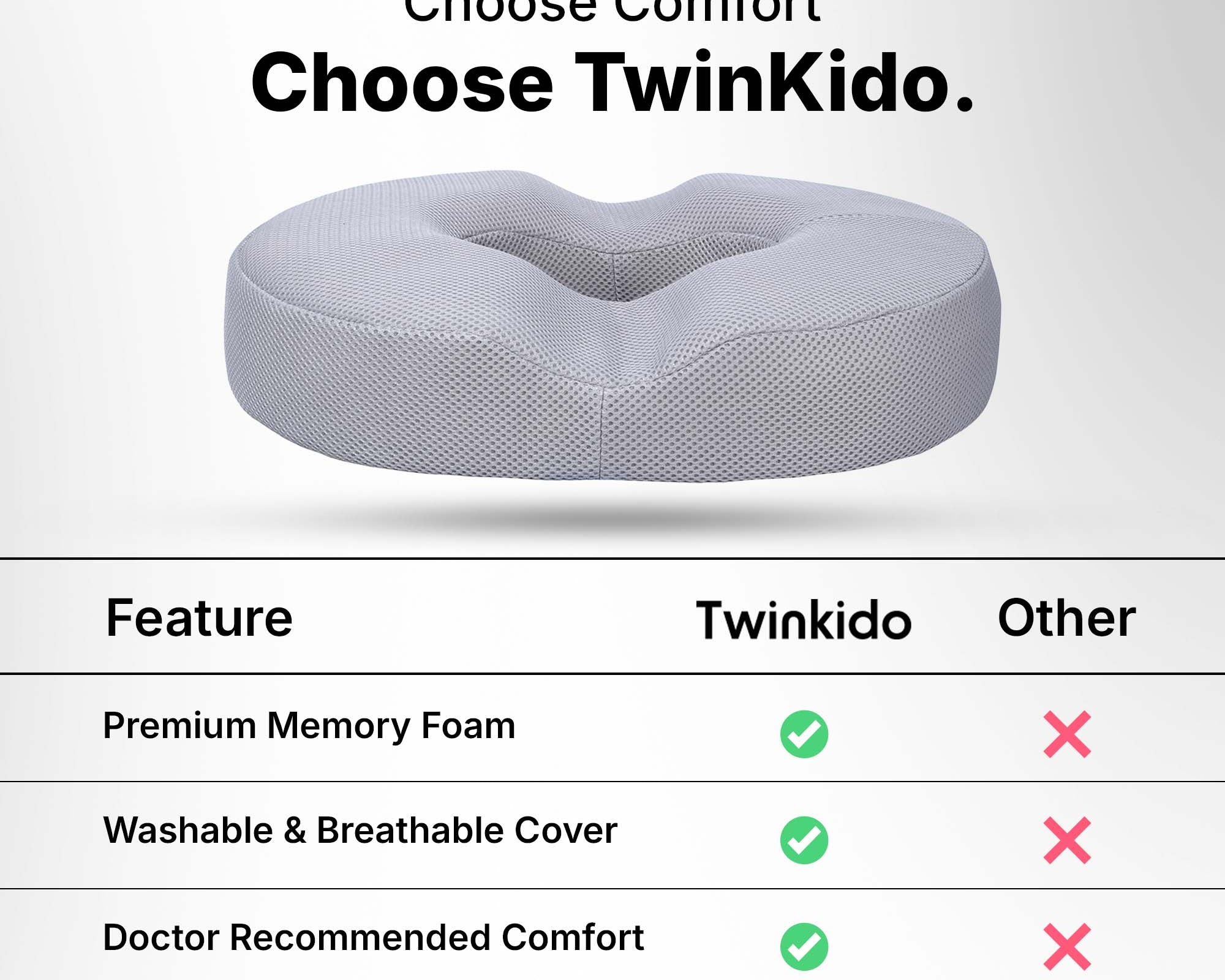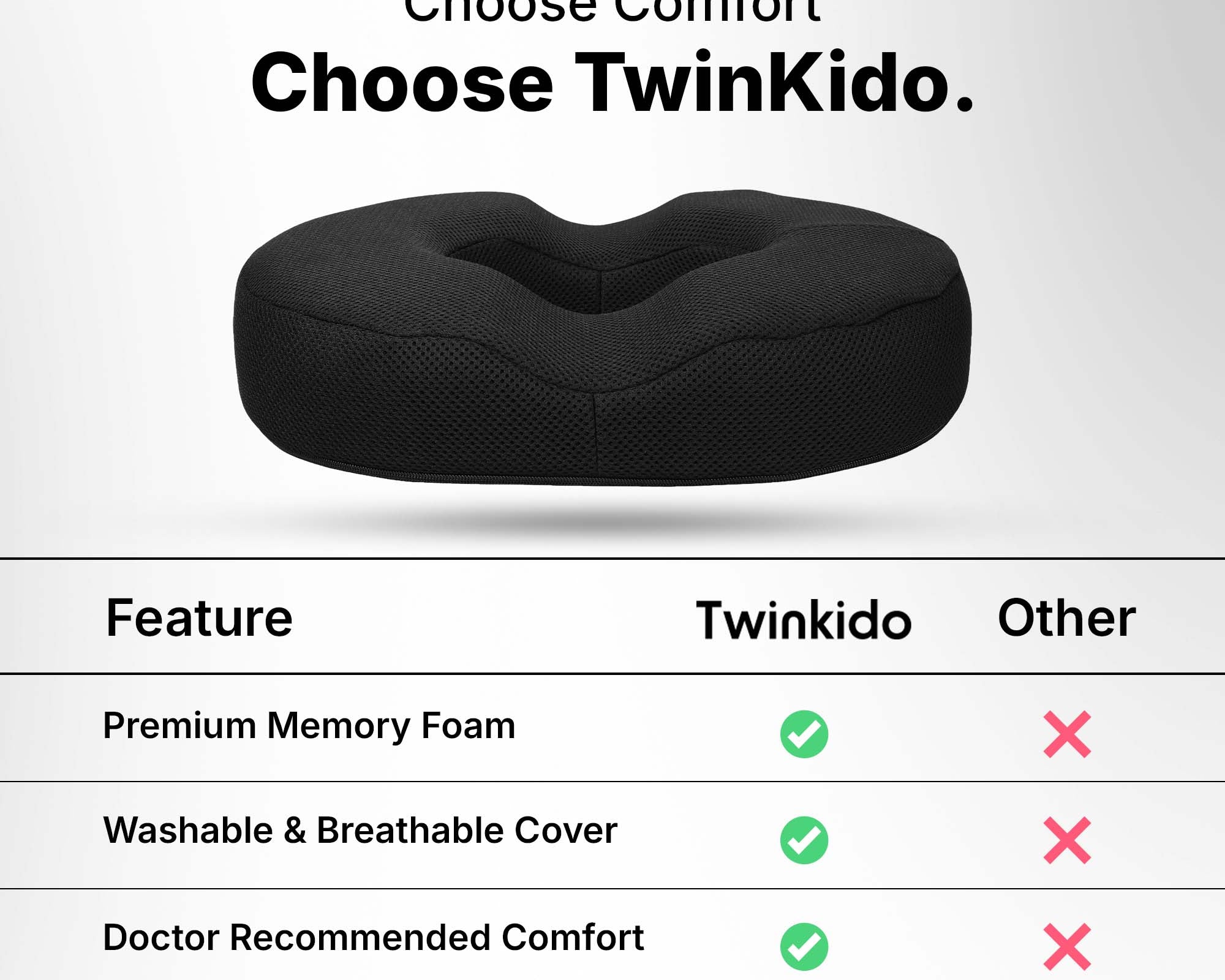 Twinkido is a brand committed to offering you better comfort and well-being through ergonomic solutions. Our products range from donut cushions and wedge pillows to curved backrests and car headrests, designed to improve posture, relieve pain, and improve sleep quality.